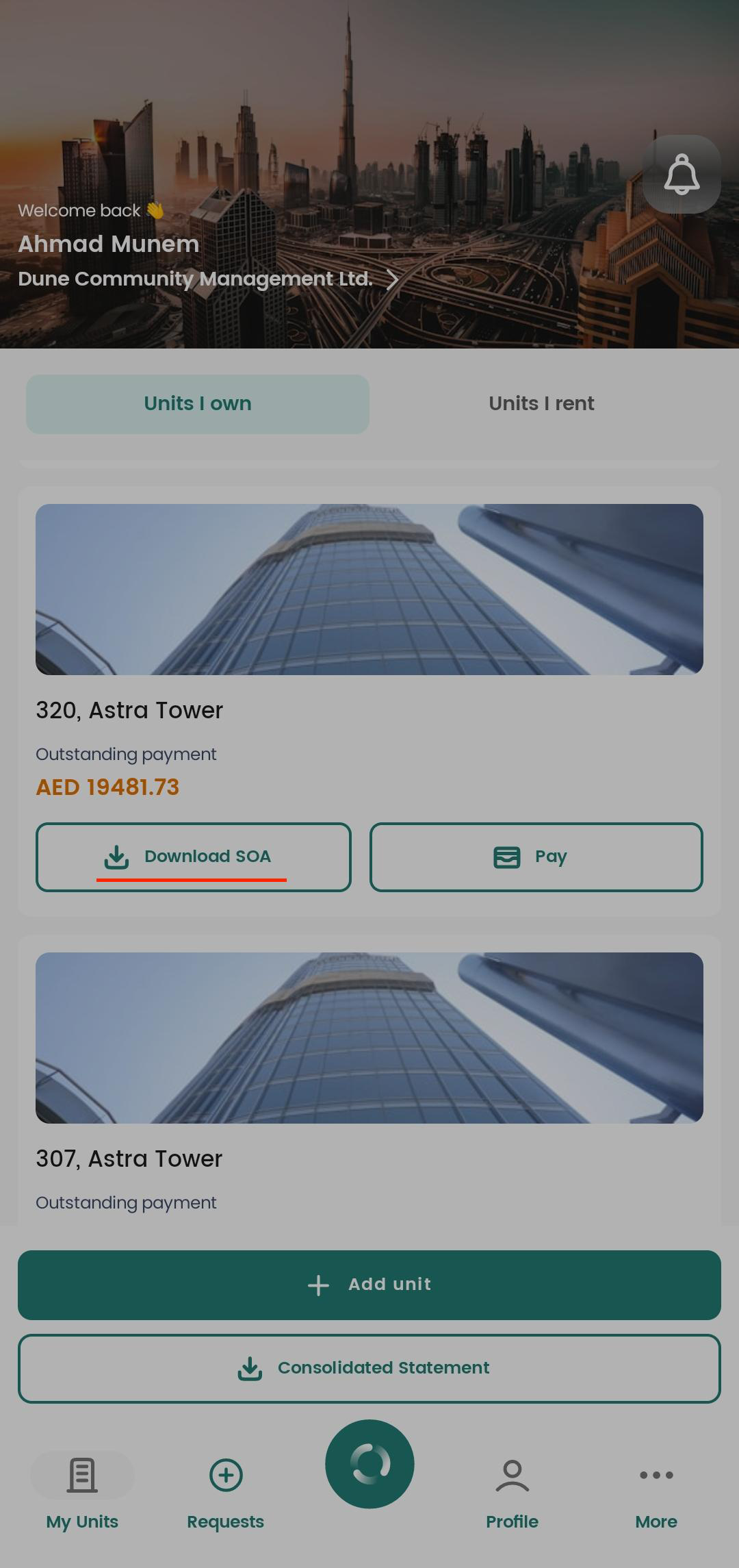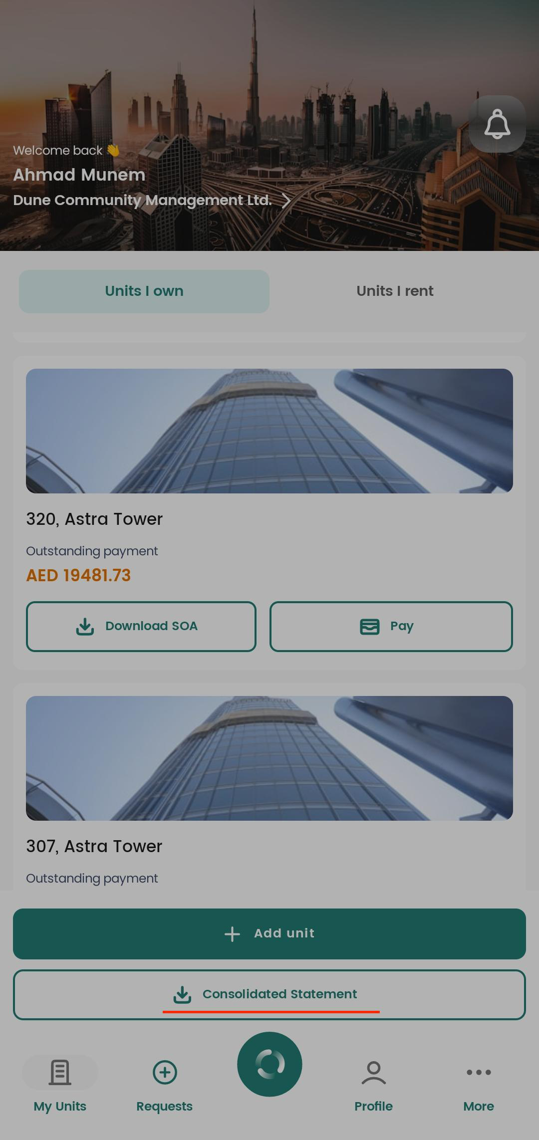 If you own multiple units, you can download a consolidated statement by tapping the Consolidated Statement button at the bottom of the My Units screen.