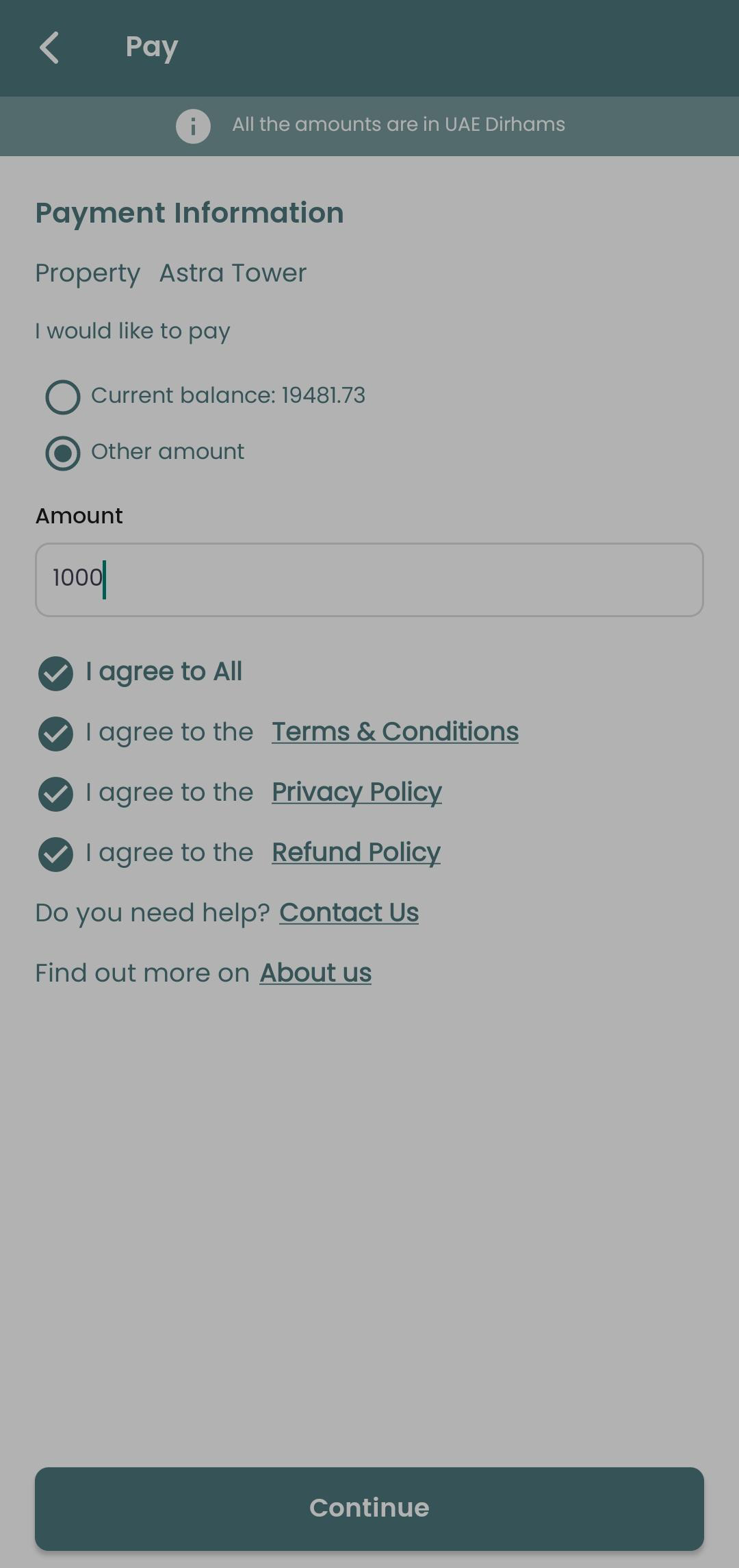 On the home page, tap Pay, or tap the Pay button from the My Units screen.