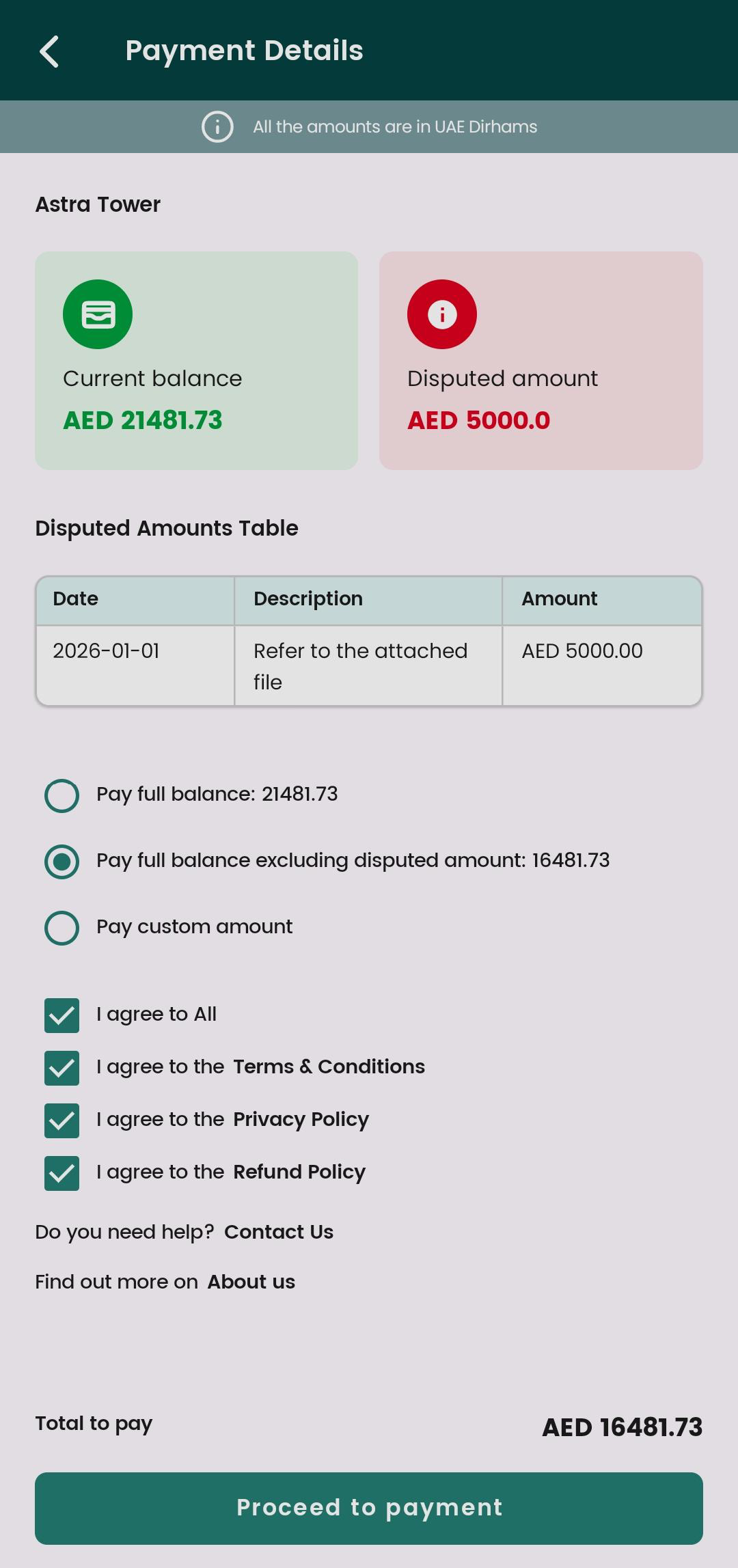 When you click Pay, the payment page will clearly display the disputed amount in a table.