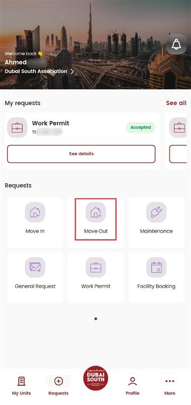To create a Move-Out request, the first thing you have to do is open the DSA app. After you have logged in to your account, the first step is to click on the Requests button, then click on Move-Out.