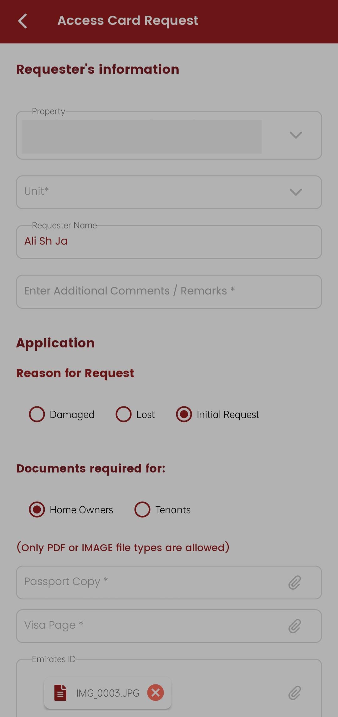 Now an Access Card form is open for you, and you need to fill in all of the requested information and upload the requested documents