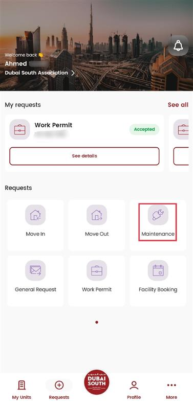 To create a Maintenance request, the first thing you have to do is open the DSA app. After you have logged in to your account, the first step is to click on the Requests button, then click on Maintenance.