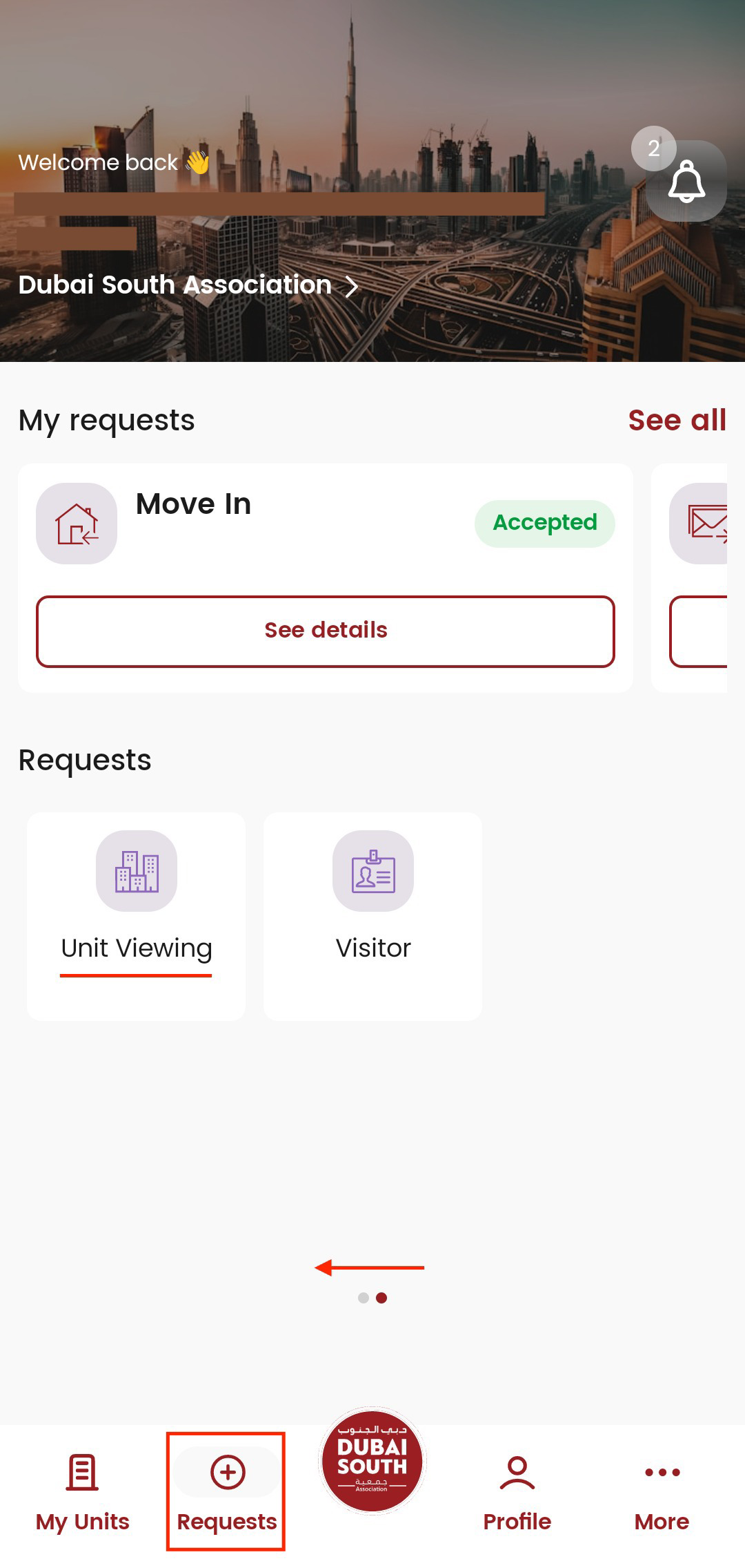 To create a Unit Viewing request, the first thing you have to do is open the DSA app. After you have logged in to your account, the first step is to click on the Requests button, then swipe to the left and click on Unit Viewing.