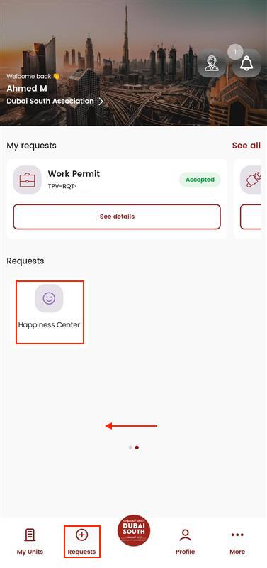 To create a Happiness Center request, first open the DSA app. After logging in to your account, tap the Requests button on the home screen, then swipe left to find Happiness Center.